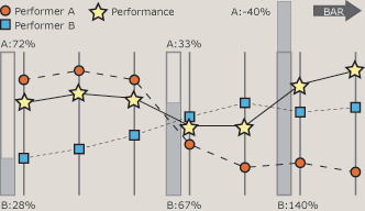 テンポのモーフィングを例にとると,縦軸をテンポの大きさ(早さ)とすることができる.ユーザは,Performer AおよびBのテンポをモーフィングするの割合を設定し,任意のテンポを得ることができる.モーフィングによる操作は,特に,拍打では表現できない拍内表情の表現の幅を広くするのに有用である.